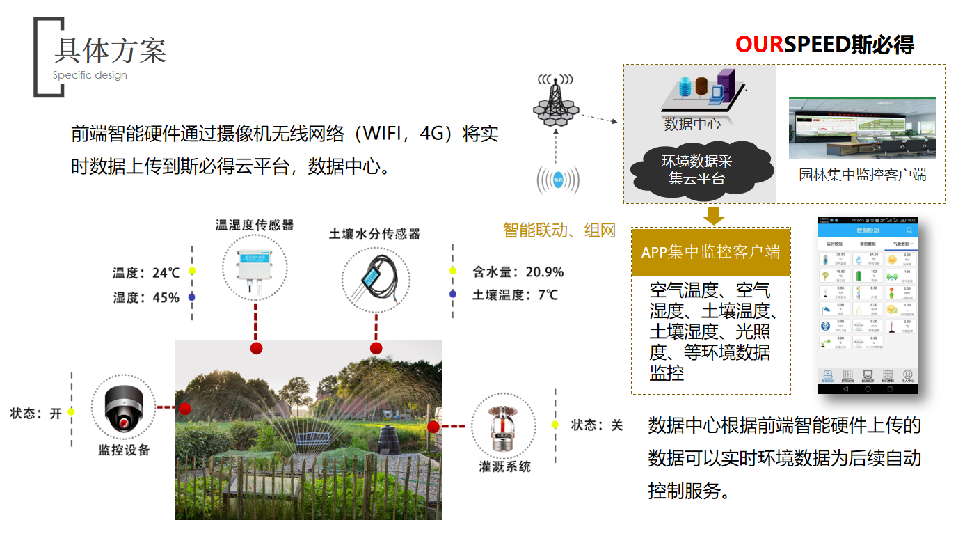 园林环境及墒情监测优势:实现管理人员对园林各个区域的环境温度、湿度、风速、光照、土壤水分等参数进行监测;对园林绿化业务全流程进行精细化管理,对环境变化可进行认为干预,减少植物折损率;对园林喷灌用水量进行监控,为水资源利用提供有效的数据分析支持;根据土壤墒情及环境参数现状建立用水量及灌溉方法数学模型。