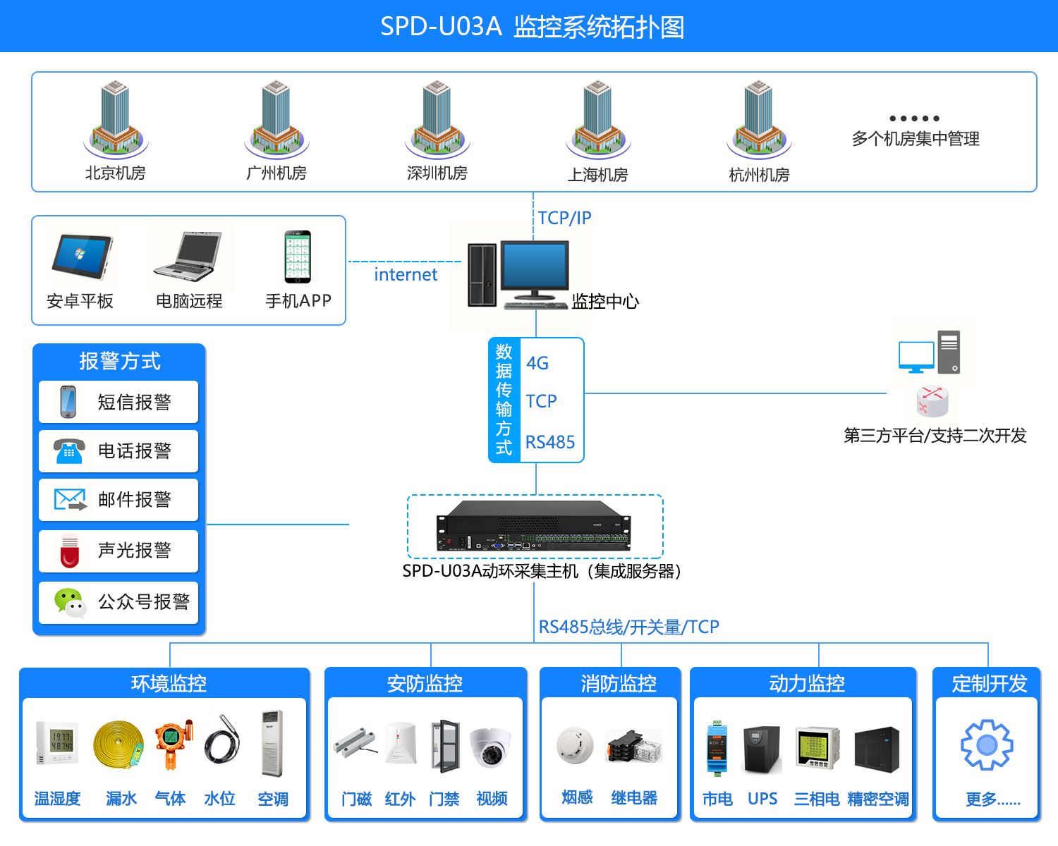 SPD-U03_1嵌入式一体化监控主机,接口采用标准的网口、RS485/等标准化接口,标准行业19寸机架式安雯结构。外接的传感器设备的供电部分由监控主机进行供电,无需额外供电。配合动环软件可以实现配电监控、UPS监控,停电监控、空调监控、漏水监控、视频监控、门禁监控、温湿度监控、烟感监控、防盗监控等。警情发生时可实现声光报警、短信报警、电话语音报警、邮件报警等报警方式。实现监控报警并联动控制功能,内嵌WEB软件。用户通过IE浏览器查看环境、设备参数、报警、报表等信息,无人值守现场、仓库等场景的动力、环境、安全及网络的一体化监控而设计。实现了机房设备的统一监控,减轻了机房维护人员负担,提高了系统的可靠性,实现了机房的科学管理位置确认。