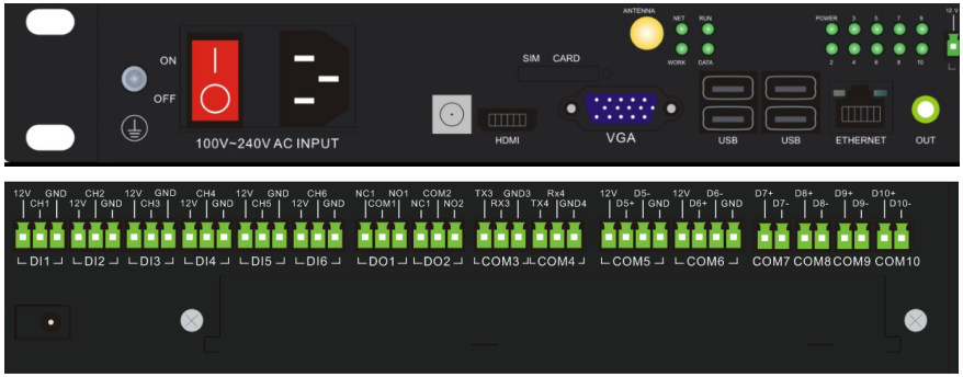3. 12V电源输入:主机12V电源供电,有一路12V后备电源接口