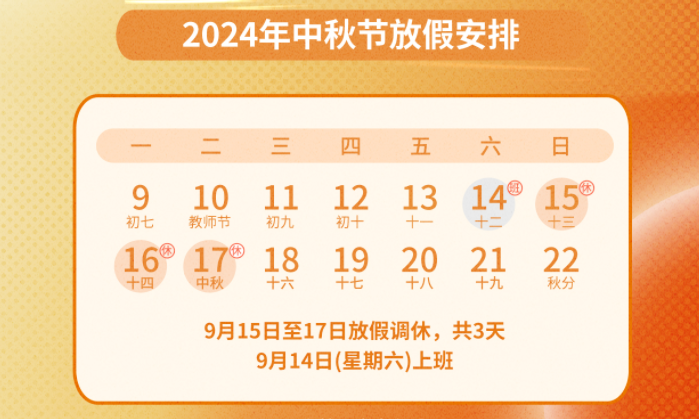 根据国家节假日安排,结合我司实际情况,中秋节假期定于9月15日至9月17日(共计3天),9月18日(星期三)恢复正常上班。请各位同事提前做好工作对接,确保假期期间公司业务的平稳运行。