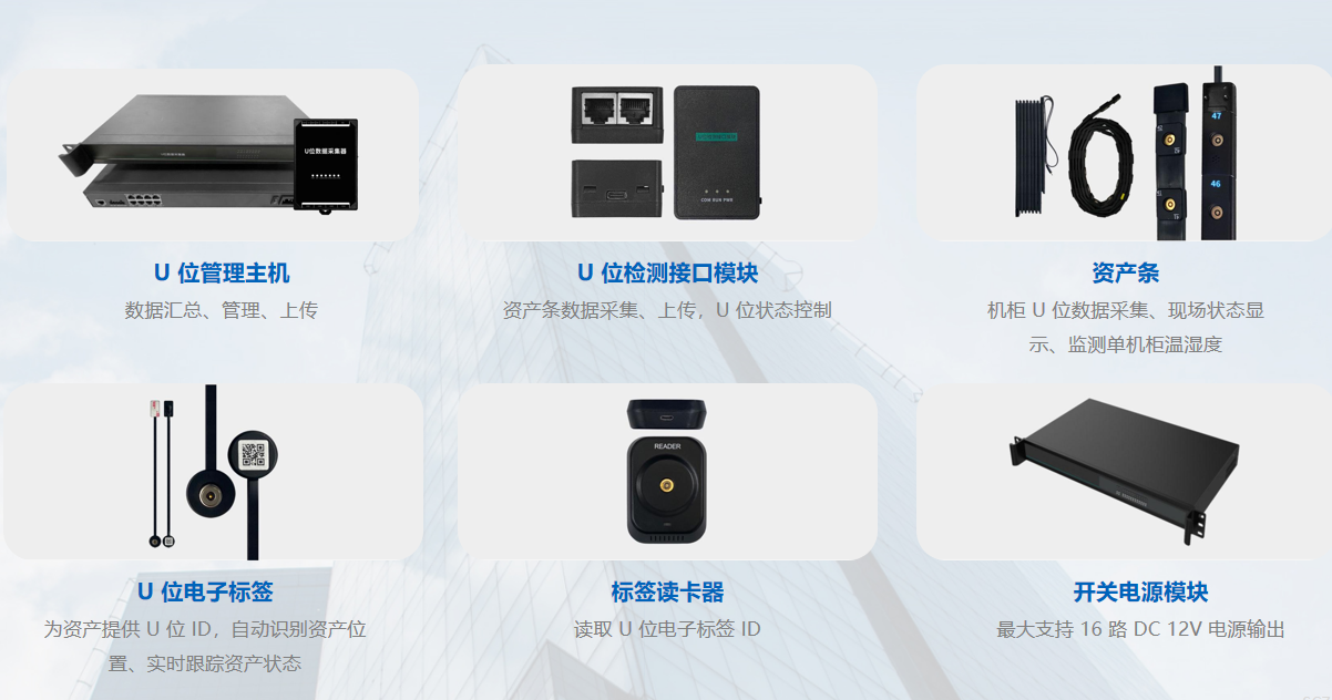 系统由 U 位管理主机、U 位检测接口模块、资产条、U 位电子标签、标签读卡器、开关电源模块等设备组成。