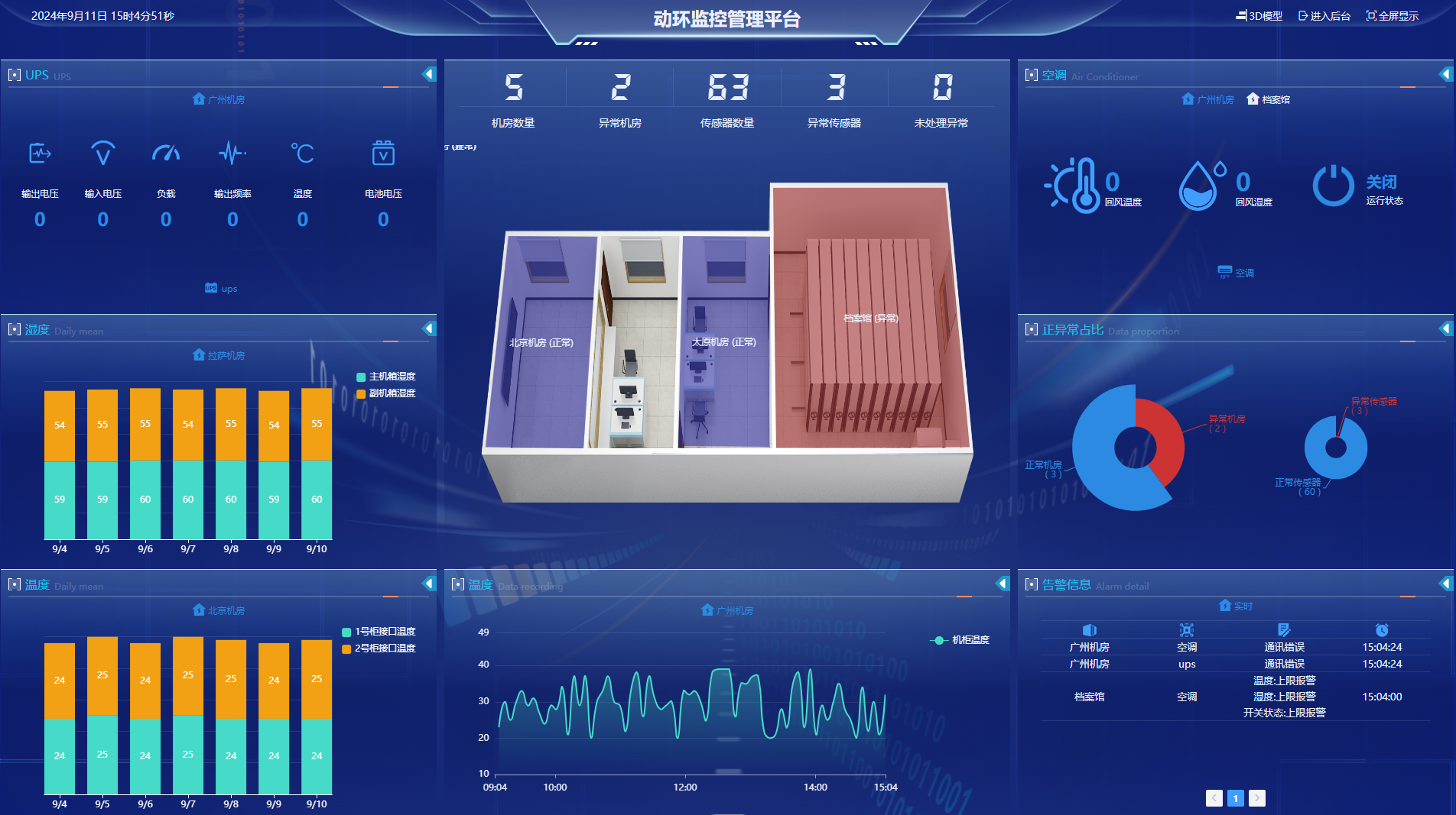 5、环境系统: 精密空调、泄漏、温度、湿度、新风机、气体、尘埃;精密空调:监测回风温度/湿度等参数,压缩机、风机、加湿器、去湿器等部件的状态,控制空调的启停,调节温度和湿度。普通空调:通过对其控制电路的分析,可实现对普通空调的状态监测和启停控制。新风机:新风机工作状态监测以及启停控制。温湿度:监测各房间温湿度传感器所采集的温度和湿度数据,并越限报警。